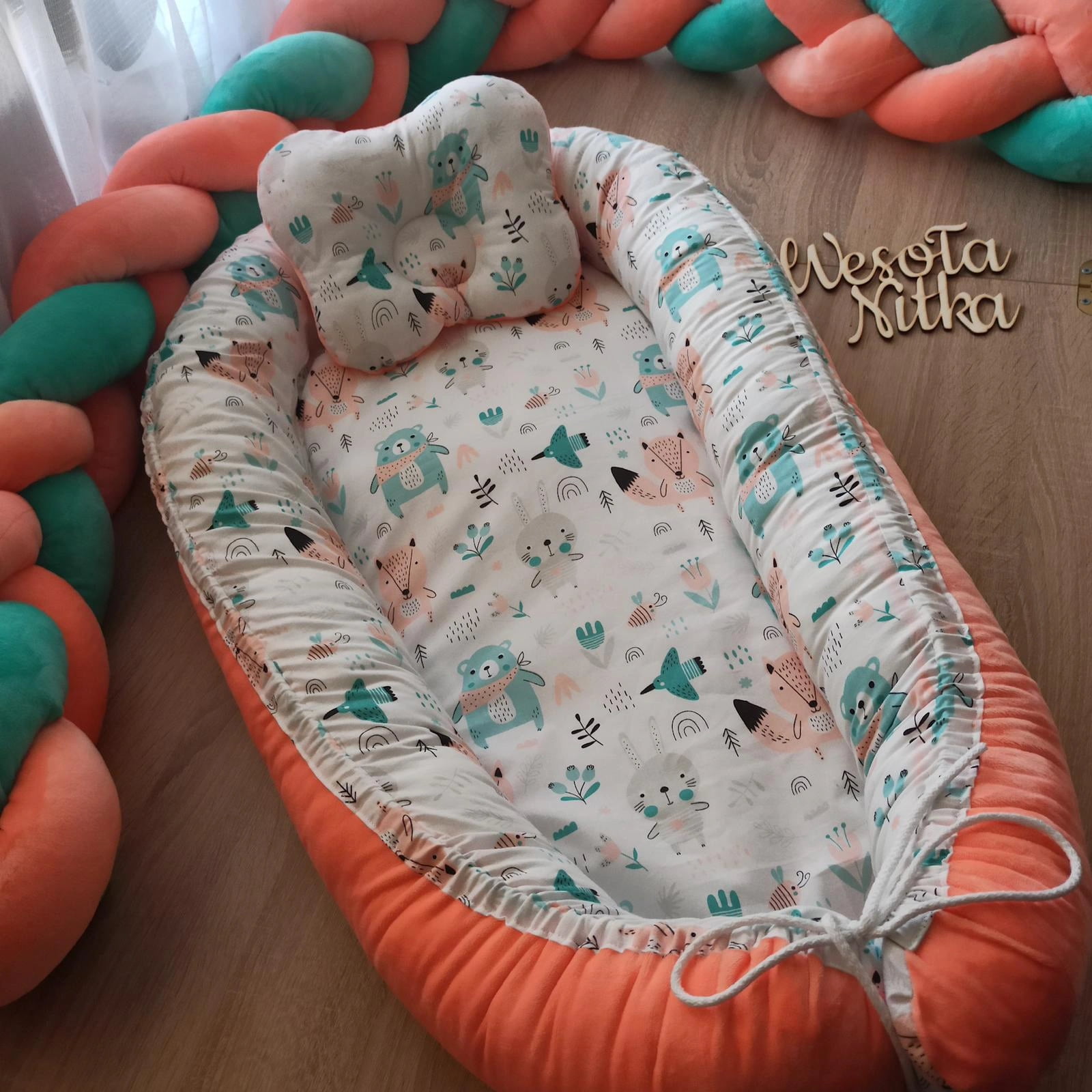 Wymiary: 90x60cm. Materiał bawełna tradycyjna w połączeniu z minky plusz. Materacyk pinka 3cm grubości. Brzegi wypełnione kulką silikonową antyalergiczną.