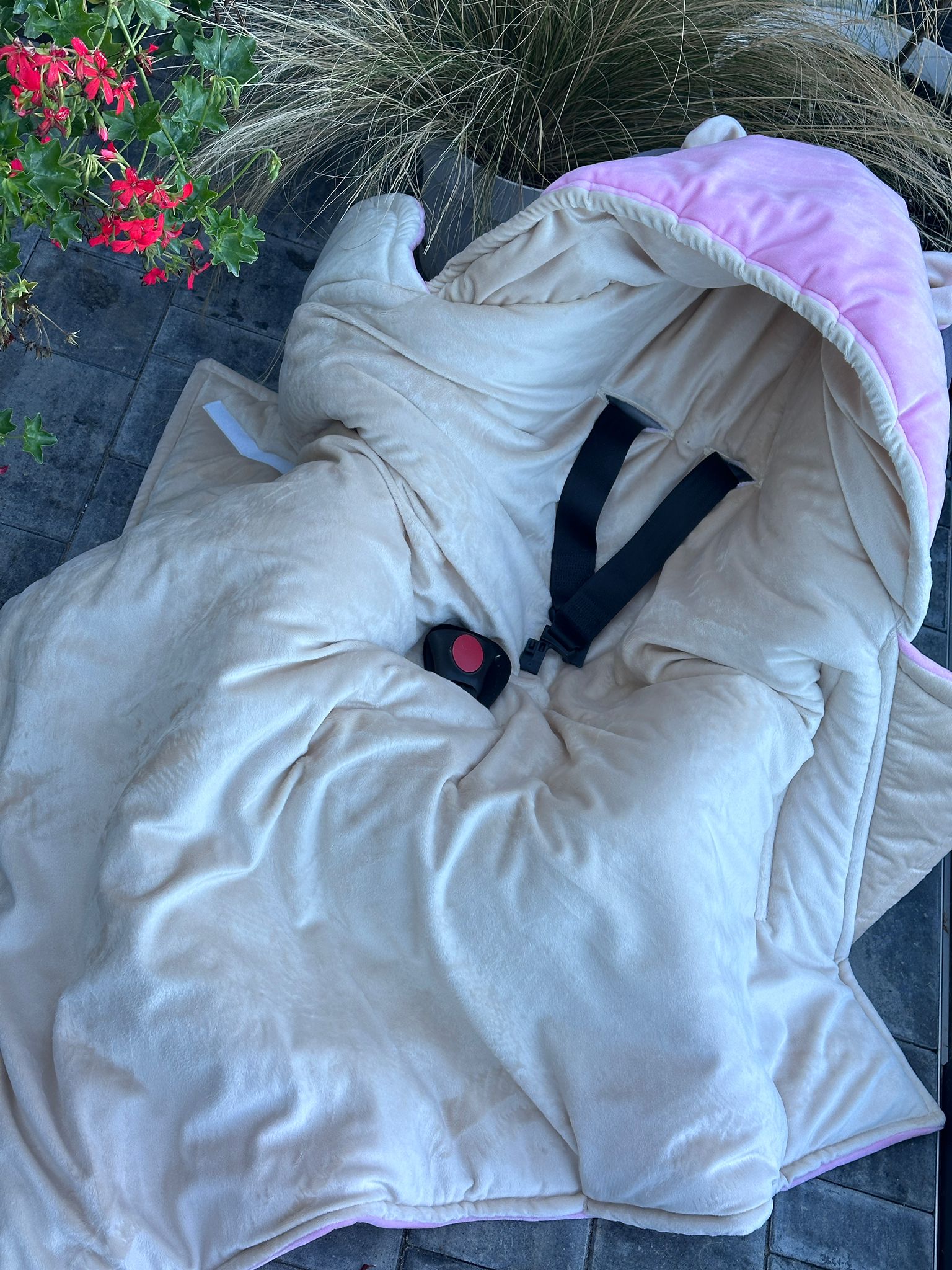 Posiada otwory na 3-punktowe pasy bezpieczeństwa, dzięki czemu świetnie pasuje do fotelika, gondoli i wózka.