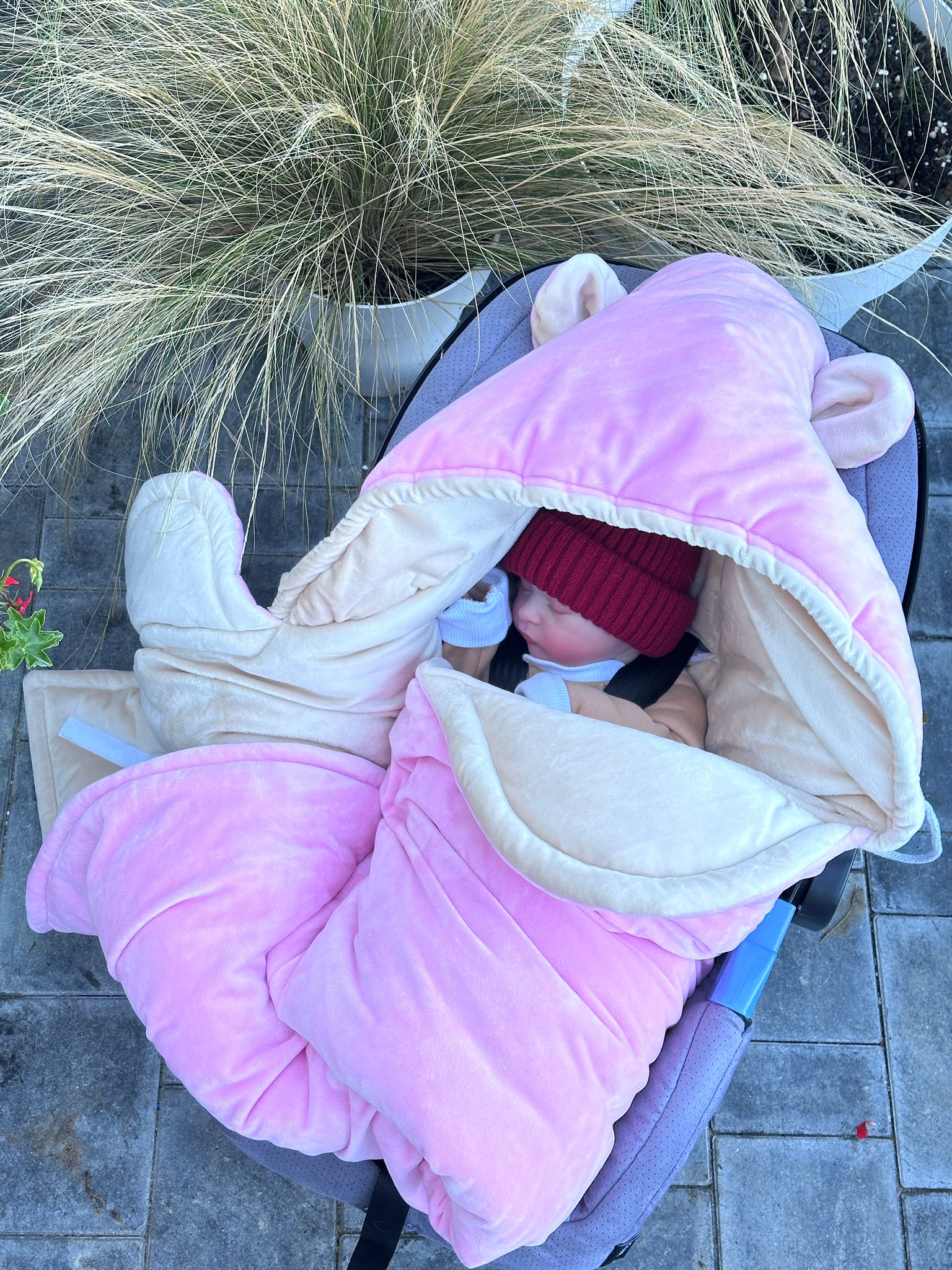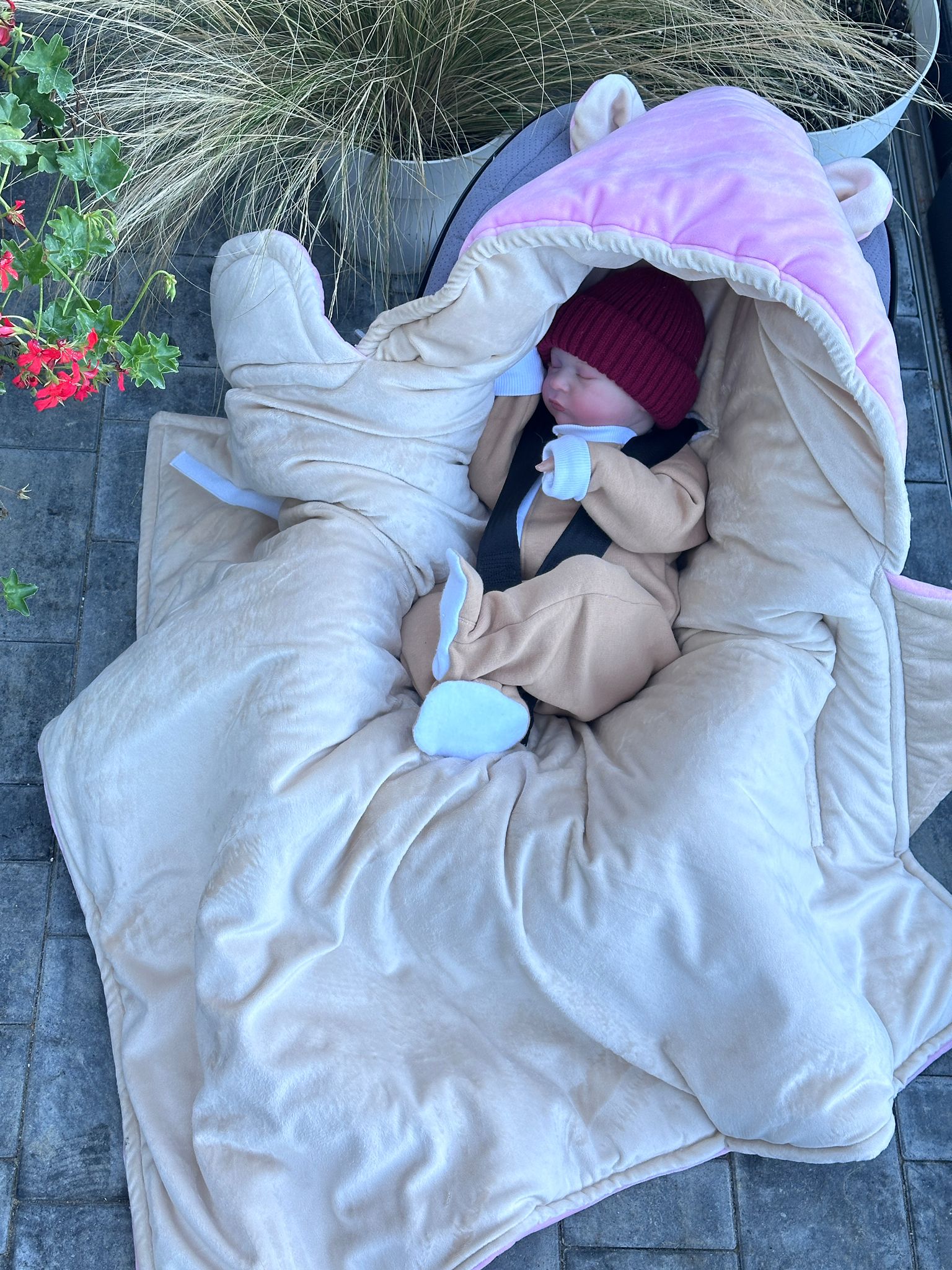 Otulacz jesienny w dużym rozmiarze 100×100 cm, wykonany z podwójnego minky plusz oraz antyalergicznego wypełnienia 2 cm, zapewnia maluszkowi ciepło i przytulność nawet w chłodniejsze dni.