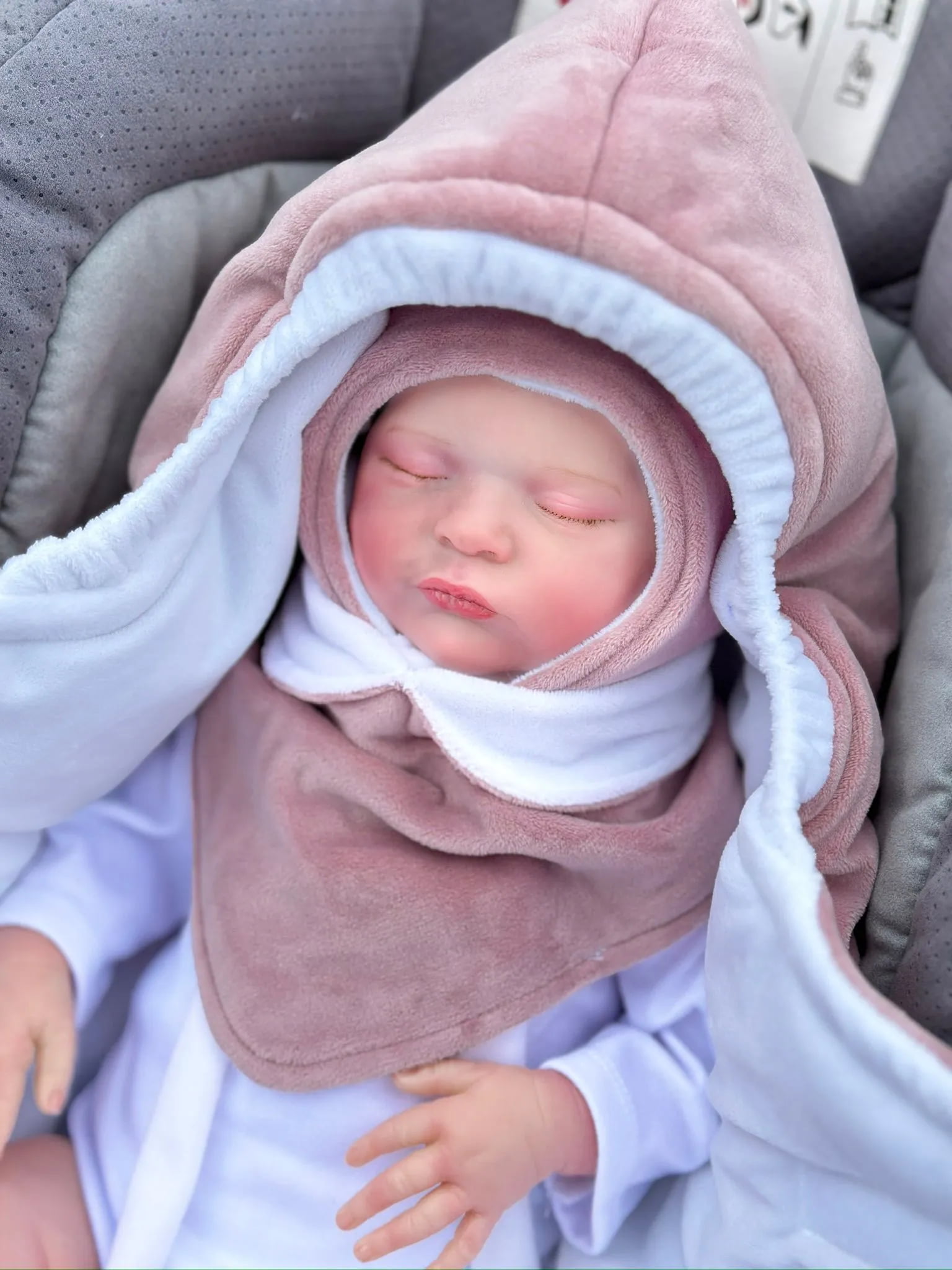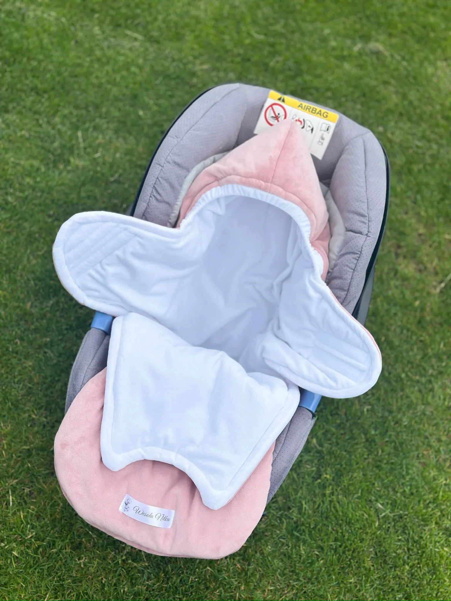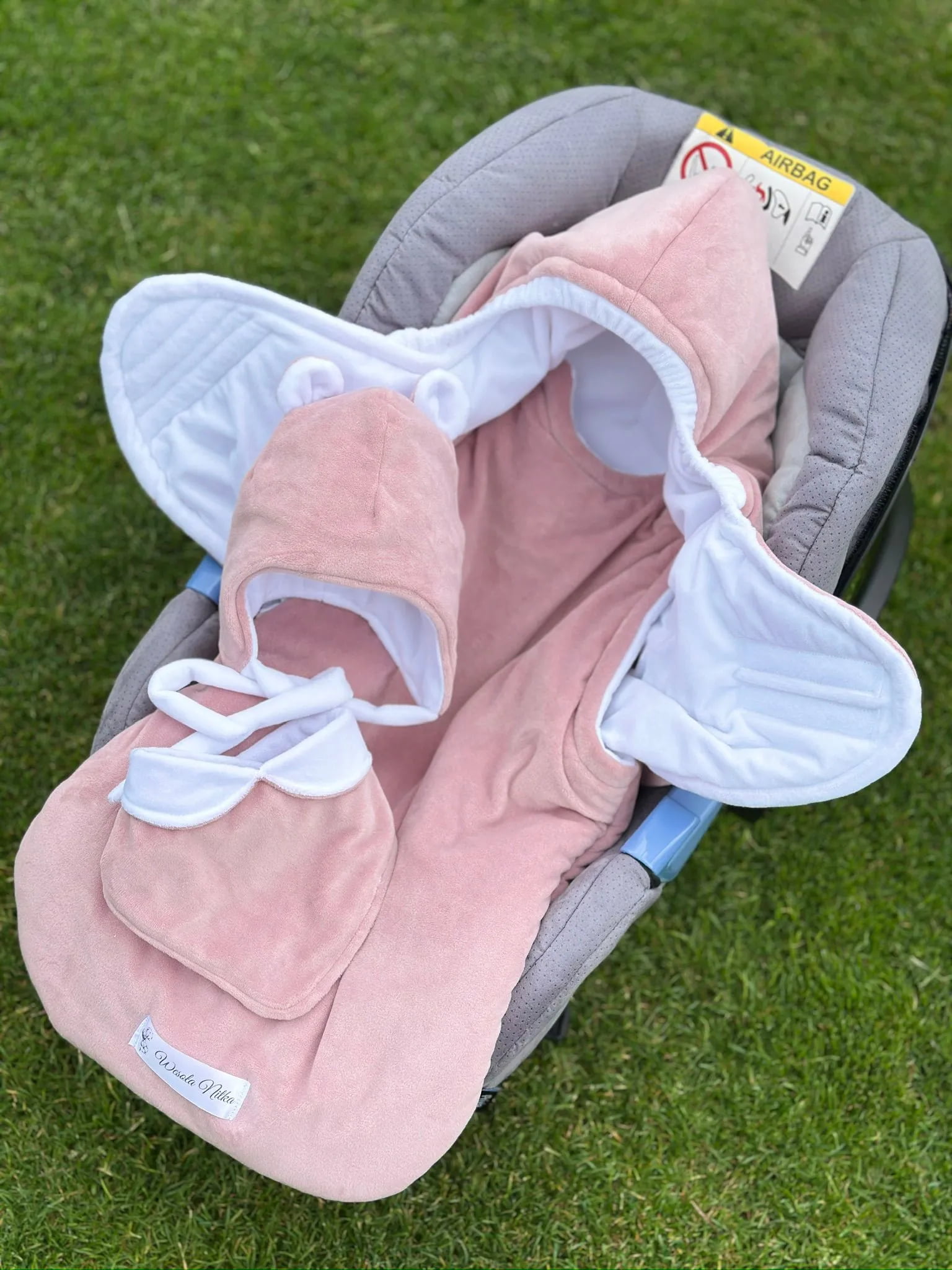 Śpiworek ma otwory na 3-punktowe pasy bezpieczeństwa, więc idealnie pasuje do fotelika. Na kapturze przy buzi dodaliśmy ściągacz gumowy, który pozwala dopasować ochronę do pogody.